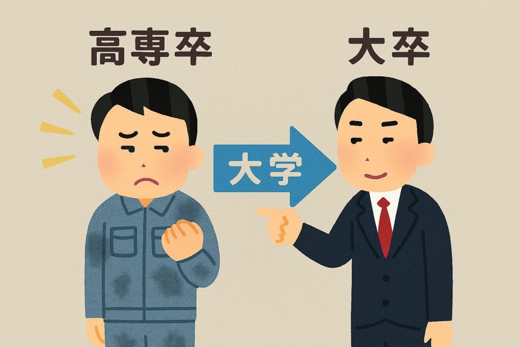 実際私の会社(大企業)も、大卒と高専卒では初任給はもちろん、仕事内容も昇進のスピードも全く異なります。